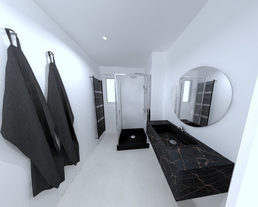 - 1 chambre spacieuse et lumineuse avec accès direct possible à votre salle de bain équipée d'un bac de douche extra plat 1 m x 1 m, un meuble vasque avec miroir, spot et mitigeur,