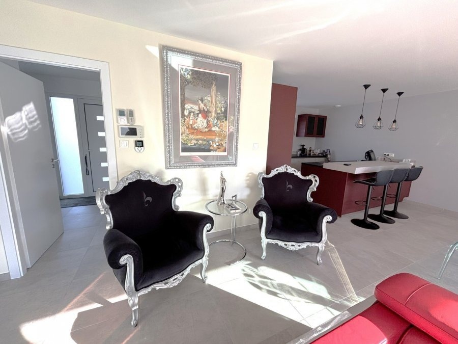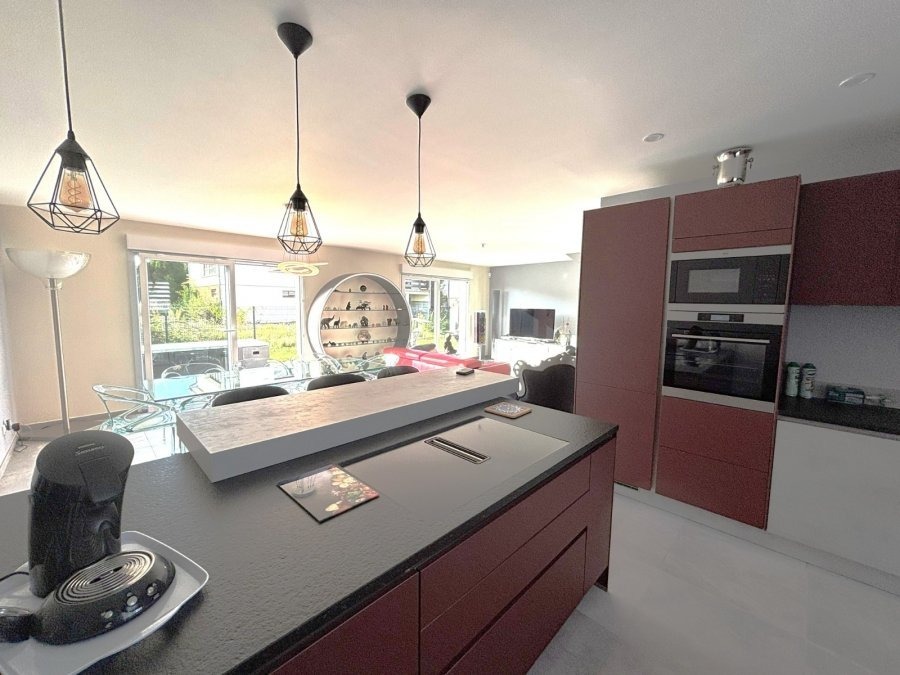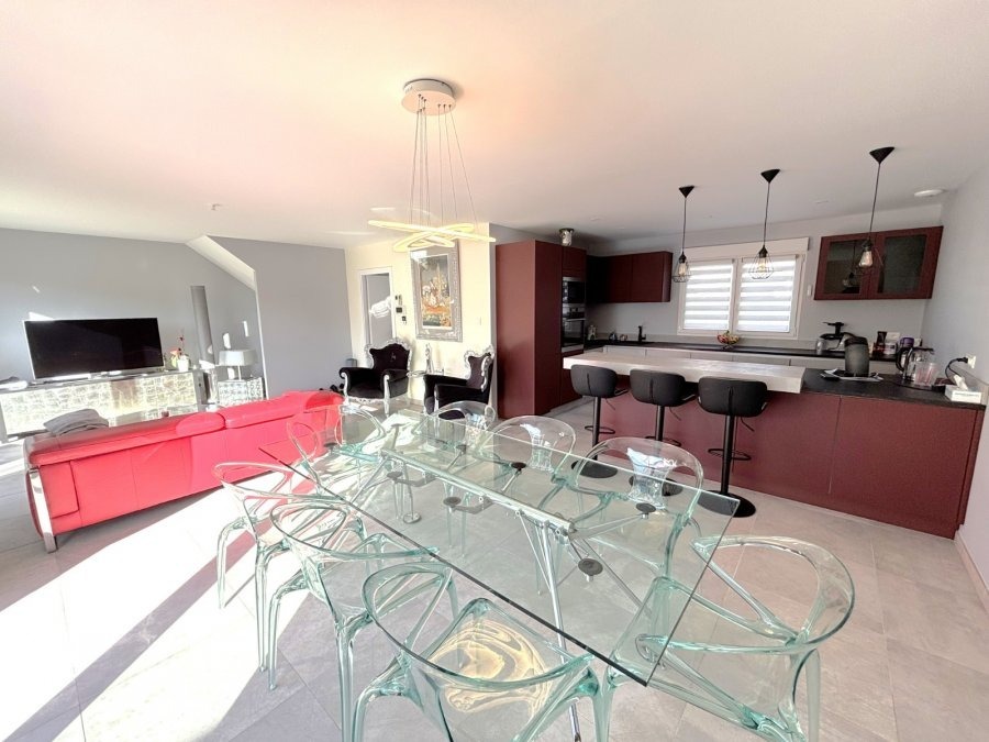 d'un grand et lumineux espace de vie de 51m² ouvert sur une belle cuisine équipée avec accès direct à la terrasse et au jardin, complètement clôturé,
