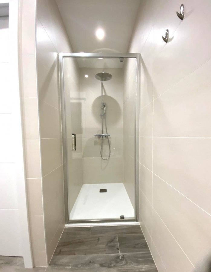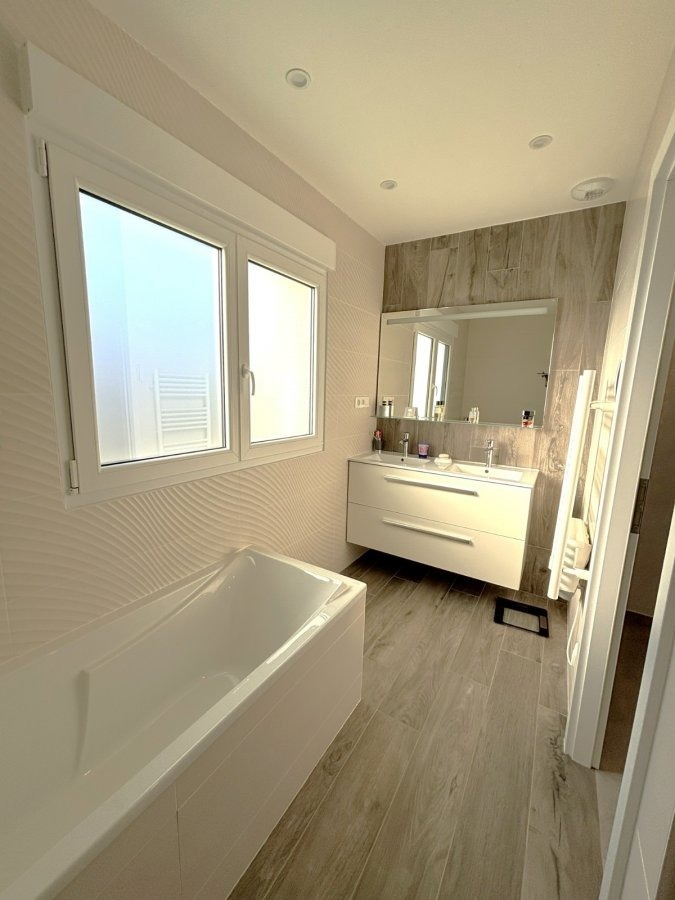 d'une salle de bain avec baignoire, douche bac extra plat (120 x 90), meuble double vasque, sèche serviette électrique,